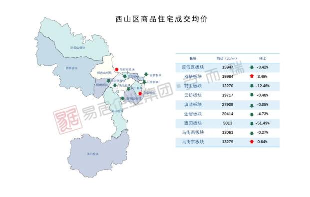 滇池泊屋項目低價備案,帶動前衛板塊成交均價回落至12270元/平方米,環比下降12.46%。