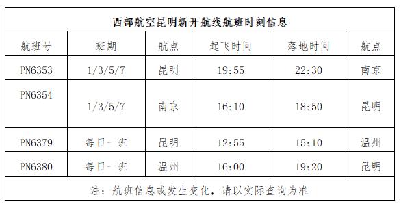 10月29日起,西部航空新開昆明直飛南京及溫州航線