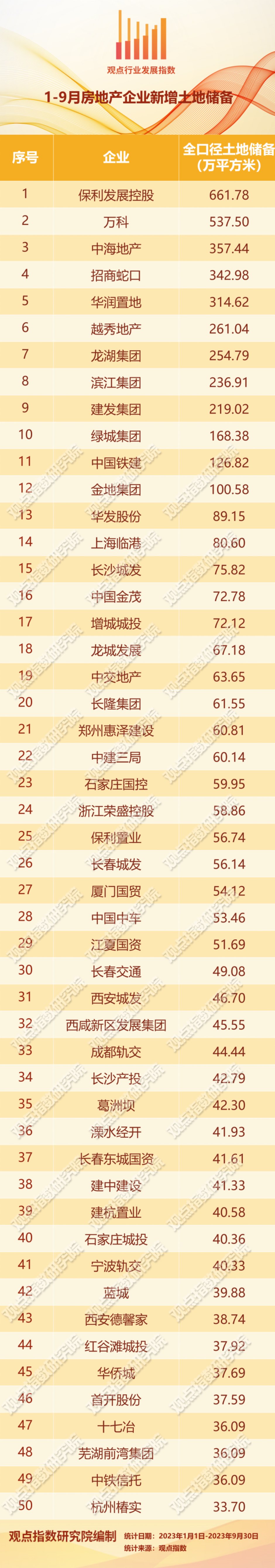 觀點指數發布的“1-10月房地產企業新增土地儲備報告”顯示,報告期內前50房企新增土地建筑面積5527.4萬平方米,同比減少30.9%。