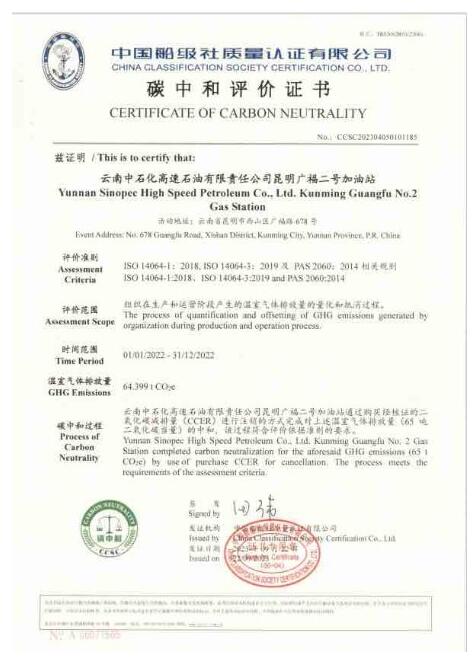 近日,中國石化昆明廣福二號加油站獲中國船級社質量認證有限公司頒發的碳中和證書,成為云南省首座碳中和加油站。