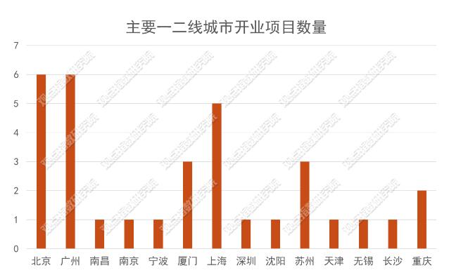 城市分布上,14個主要一二線城市均有項目開業。北京廣州上海有數個項目入市,而深圳新項目則相對較少;二線城市上,廈門、蘇州及重慶表現突出,有超過1個新項目開出。