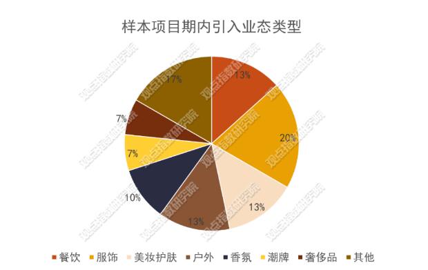 期內,觀點指數觀察下的樣本項目在新店引入上類型豐富,其中占比較大的業態分別為服飾、餐飲及美妝護膚,而服飾中還包括以男裝或女裝為主打的品牌。