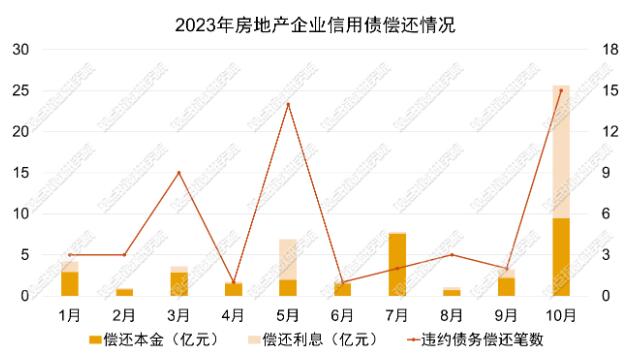 信用債償還方面,10月同樣迎來2023年償還債務高峰,共錄得15筆債務償還事件,其中償還本金為9.44億元,償還利息16.21億元。