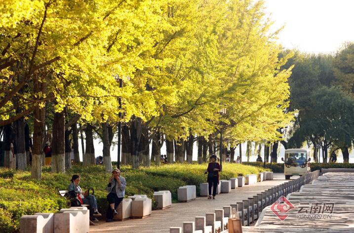 進入深秋,昆明市大觀公園銀杏林漸漸變黃,浪漫寧靜的氛圍吸引了不少市民前來拍照打卡。大觀公園內種植了1000多棵銀杏樹,其中600余棵集中在長聯文化大道附近,銀杏黃在“昆明藍”的襯托下,為春城增添靚麗的色彩。