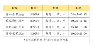 西雙版納—騰沖航線每周二、四、六執(zhí)飛,執(zhí)行機型為波音737,去程于10:30自西雙版納起飛,11:45到達騰沖;西雙版納—濟南航線,每周二、四、六執(zhí)飛,執(zhí)行機型為空客320,去程于15:00自西雙版納起飛,18:20到達濟南。