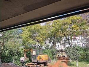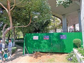 從南廣場出口往西直行約200米,看到二環橋下的綠化帶已被綠色圍擋圍住,上面寫著“施工重地,注意安全”幾個字。里面傳出“咚咚咚”的施工聲,透過縫隙可見一臺挖掘機正在作業,還有幾名工人在施工。