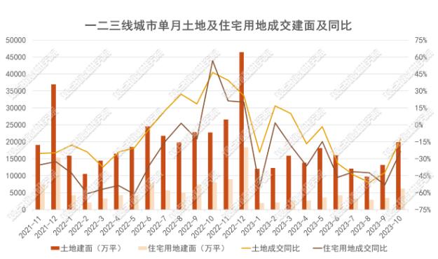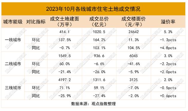 住宅用地方面,一二三線城市成交住宅用地942宗,成交土地規劃建筑面積6161萬平方米,環比上升71.4%,同比下降23.5%;成交總價3269億元,環比上升47.7%,同比下降8.6%;成交樓面均價5306元/平方米,環比下降13.8%,同比上升19.5%;平均溢價率3.32%。