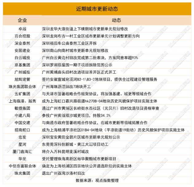 城市更新方面,據不完全統計,截至10月14日,超過20家企業在城市更新業務上有新動態,包含規劃調整、實施主體確認、規劃公示、工程進度更新等。