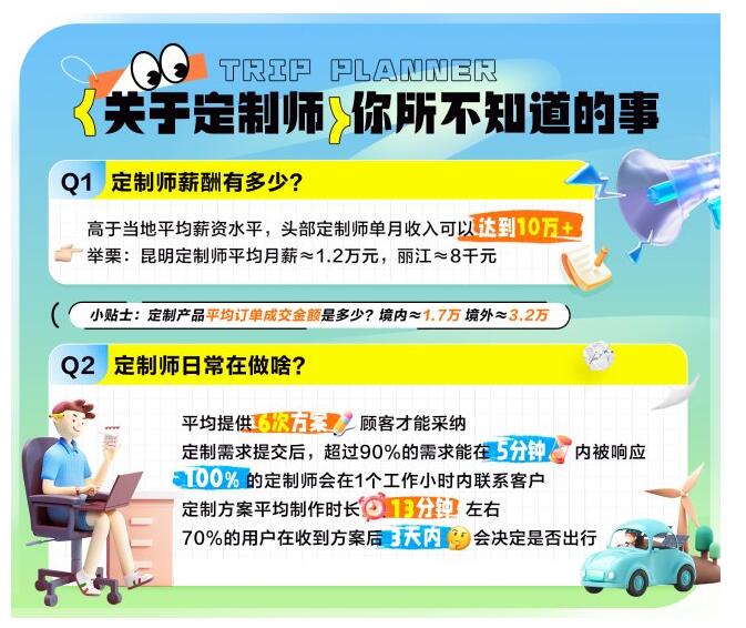 定制師一對一創造性的工作也決定了可觀的收入,有頭部攜程定制師在旺季單月收入可達10萬元。攜程數據顯示,根據頭部供應商的抽樣反饋,以旅游大省云南省為例,昆明的攜程定制師平均月薪在1.2萬元左右,麗江在8千元左右。一些頭部定制師甚至可以月入8至10萬元。小白定制師通過1至2年的職場訓練,就有望在技能和個人收益上獲得明顯提升。
