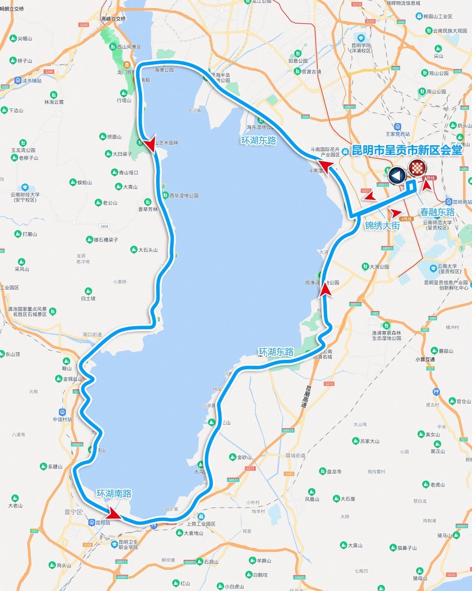 3.競賽路線:由昆明市市級行政中心會議中心前螺州街出發(fā)左轉(zhuǎn)—經(jīng)和諧路右轉(zhuǎn)—經(jīng)錦繡大街左轉(zhuǎn)—經(jīng)春融西路右轉(zhuǎn)—進(jìn)入駝峰街逆行道—過三鋁路交叉口后靠右直行進(jìn)入駝峰街順行道右轉(zhuǎn)—經(jīng)環(huán)湖東路左轉(zhuǎn)—經(jīng)湖濱路—望海路—湖濱西路左轉(zhuǎn)—經(jīng)高海路輔路直行—經(jīng)暉灣收費站后右轉(zhuǎn)進(jìn)入高海高速逆行道—經(jīng)海豐收費站后出高速左轉(zhuǎn)—進(jìn)入環(huán)湖南路—經(jīng)過石寨山遺址直行—古滇文化名城直行—進(jìn)入環(huán)湖東路直行—經(jīng)撈魚河濕地公園直行—經(jīng)七星隧道右轉(zhuǎn)—經(jīng)都林街(滇池星城)左轉(zhuǎn)—經(jīng)海湖路右轉(zhuǎn)—經(jīng)駝峰街左轉(zhuǎn)—經(jīng)春融西路右轉(zhuǎn)—經(jīng)錦繡大街左轉(zhuǎn)—進(jìn)入春融東路逆行道左轉(zhuǎn)—經(jīng)螺州街隨后到達(dá)比賽終點昆明市市級行政中心會議中心。