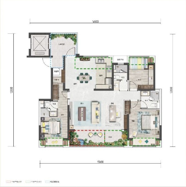 建筑面積約123平方米的洋房戶型,為四室兩廳三衛設計。這一戶型是項目在售的最大洋房戶型,入戶即是入戶花園,增添歸家儀式感;同樣,該戶型與上一戶型一樣,在客廳和書房這一處可根據自身居住需求進行靈活改造;同樣的多飄窗設計,采光通風得到保障的同時,也增加了更多可收納空間;主臥套房設計,生活起居方便且私密,居住舒適;干濕分離的雙衛設計,干凈衛生,有效提高生活效率。