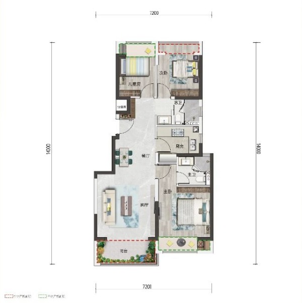建筑面積約98平方米的洋房戶型,同樣為三房兩廳兩衛設計。這個戶型比較有亮點的是書房與客廳這一處的設計,后期業主可以選擇將書房與客廳相隔開,也可以根據自身居住需求,將其打通,成為一個大橫廳設計。同樣,該戶型也有多飄窗的設計,帶來更多可拓展空間的同時,也增強了各居室的通風采光效果。