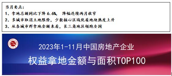 2023年1-11月,TOP100企業拿地總額10855億元,拿地規模同比下降6.6%,降幅較上月收窄3.4個百分點,連續兩月收窄。TOP100門檻值為32億元,較上年同期下降7億元。TOP100企業招拍掛權益拿地總額占全國300城土地出讓金的比例為52.3%。