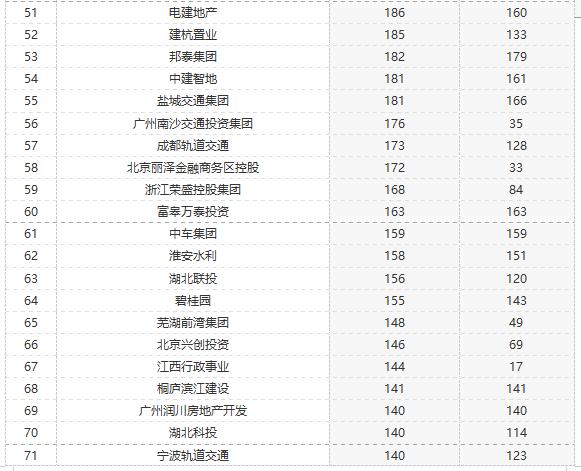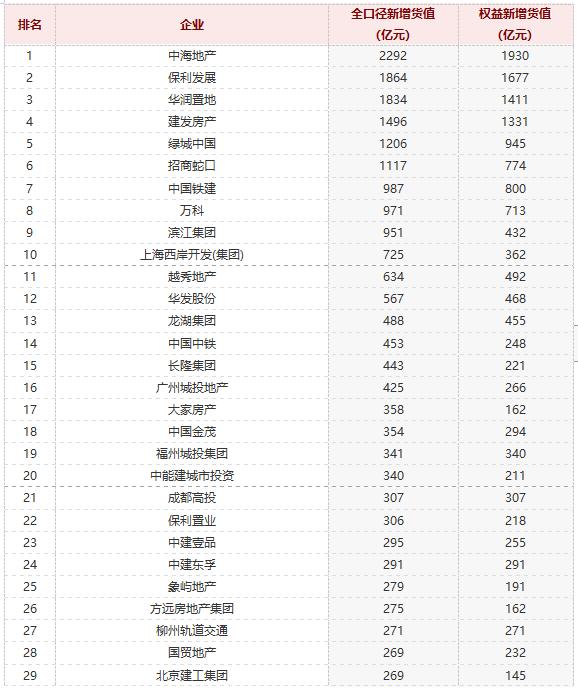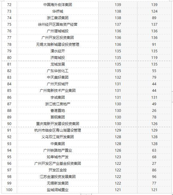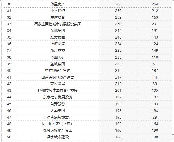 碧桂園、保利發展、萬科、華潤置地、綠城中國、中海地產、招商蛇口、金地集團、龍湖集團、建發房產、中國金茂、濱江集團、中國鐵建、越秀地產、旭輝集團、華發股份、新城控股、遠洋集團、首開股份、美的置業、卓越集團、仁恒置地、中交房地產、雅居樂、電建地產、大悅城控股、中駿集團、路勁集團、武漢城建集團、國貿地產、新希望地產、保利置業、聯發集團、華宇集團、金輝集團、大家房產、大華集團、金隅集團、金融街控股、信達地產、北京城建、星河控股、合生創展、首創城發、中冶置業、建業集團、石榴集團、星河灣集團、榮安地產、君一控股