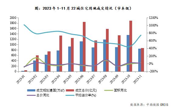 從11月土地成交情況來看,在上年低基數下22城住宅用地成交面積和總價同比均有所增長,溢價率較前四月略有上浮,但整體溢價率仍處于低位,土地市場熱度仍相對平穩。在房企投資布局仍然審慎之下,疊加年底季節性因素,優質地塊普遍競拍出高價的概率較小;而2023年以來非核心城市或區域土拍情緒延續低迷態勢,短期土拍規則調整對市場的帶動效果有限。