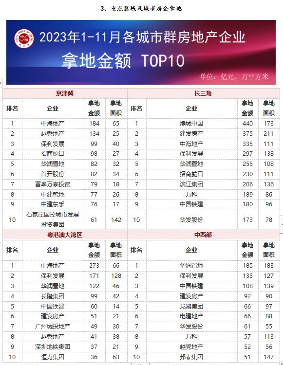 從各城市群拿地金額來看,長三角地區領跑全國。2023年1-11月,長三角TOP10企業拿地金額2680億元,居四大城市群之首。其中,綠城中國拿地金額為440億元,位居長三角企業拿地金額榜首;京津冀TOP10企業拿地金額972億元,反超粵港澳大灣區位列第二;粵港澳大灣區TOP10企業拿地金額939億元,位列第三。拿地面積來看,長三角TOP10企業拿地面積以1248萬平方米位居四區域首位。