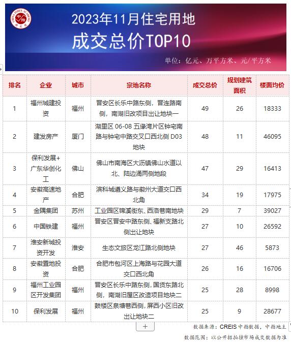 從全國住宅用地成交總價TOP10來看,11月入榜地塊成交金額門檻為25億元。入榜地塊中,晉安區長樂中路東側,晉連路南側,南湖舊改項目出讓地塊一地塊以總價49億元位居榜首,其中,福州共入榜4宗地塊,總成交金額為126億元;合肥入榜2宗地塊,總成交價分別為34億元與26億元,廈門、佛山、蘇州、淮安各入榜1宗地塊,總成交價分別為48億元、47億元、29億元與27億元。