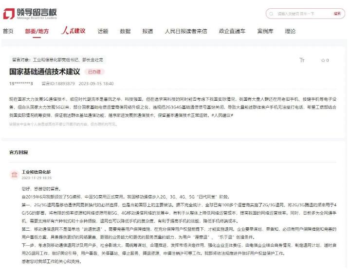 近日,工信部在人民網(wǎng)“領(lǐng)導(dǎo)留言板”就網(wǎng)友關(guān)心的2G/3G退網(wǎng)相關(guān)問題進(jìn)行了回復(fù)。