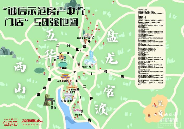為了向表現(xiàn)杰出的50家“誠信示范房產(chǎn)中介門店”鼓勵(lì)和致敬,春城晚報(bào)-開屏新聞創(chuàng)新性地制作了一份手繪“誠信示范房產(chǎn)中介門店”50強(qiáng)地圖,以獨(dú)特的方式,展現(xiàn)了所有獲選門店的地理位置。