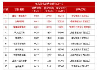 從住宅銷售金額排行看,建投·春城華府開盤后于上周首次備案,以0.5億元位列榜首;山海灣8號持續熱銷,均為高價成交,以0.41億元排名第二;富康城紫悅府開盤時簽約房源上周集中備案,以0.31億元位列第三。