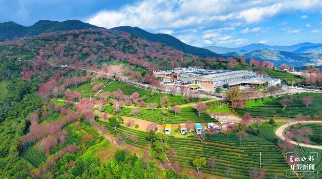 櫻花如云似霞,綻放著粉嫩的花瓣,茶樹綠如茵毯,釋放著冬日的生機,兩者相印成畫,成了冬日里無量山最絢爛的色彩。