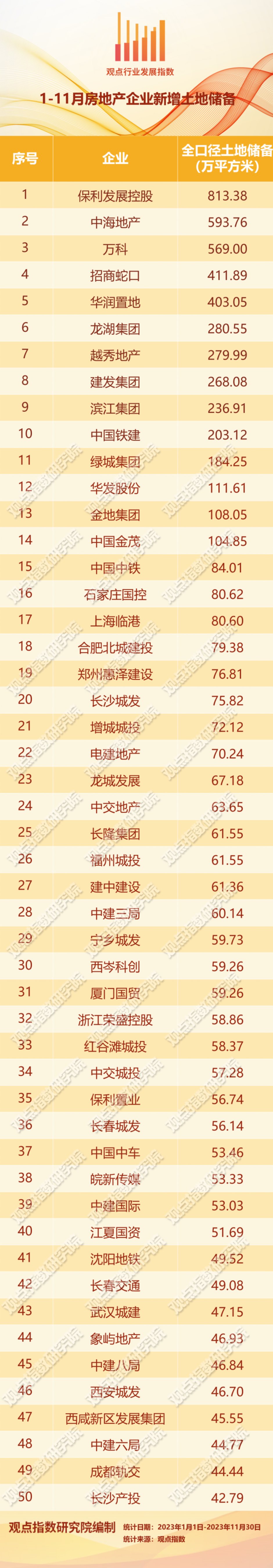 其中,保利發展、中海地產、萬科新增全口徑土地儲備分別為813.4萬、593.8萬以及569萬平方米,處于領先位置。
