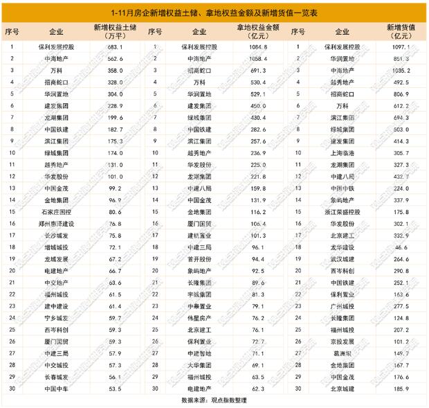 從權益拿地金額來看,11月土地投資力度最大的企業為保利發展,其次為中海地產和建發集團,分別新增101.1、52.9和48.4萬平方米。