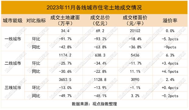 住宅用地方面,一二三線城市成交住宅用地723宗,成交土地規劃建筑面積4843萬平方米,環比下降21.8%,同比下降46.3%;成交總價1802億元,環比下降45.5%,同比下降43.6%;成交樓面均價3722元/平方米,環比下降30.3%,同比上升5.1%;平均溢價率3.72%。