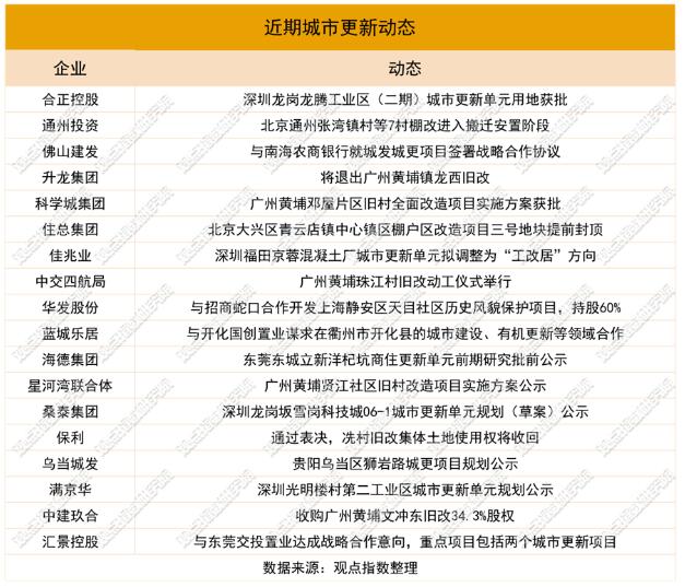 廣州黃埔區鄧屋村、珠江村、賢江村、文沖村等項目取得實質性進展。此外,白云區鶴龍街黃邊村更新改造項目掛牌招商,為年內第五個公開引入合作企業的村改項目,意味著除黃埔區外,其他區域城市更新進度亦在加快。