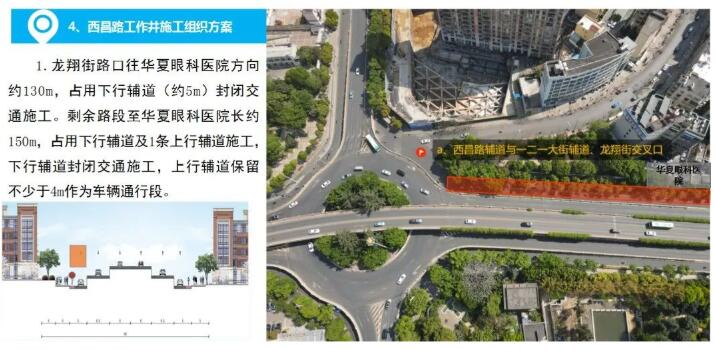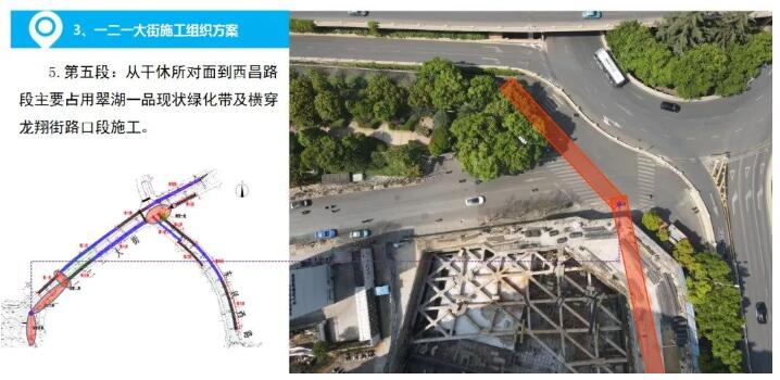 從翠湖一品橫穿段口到西昌路段采用明挖施工,主要占用翠湖一品現狀綠化帶及橫穿龍翔街路口段施工。