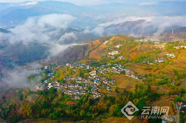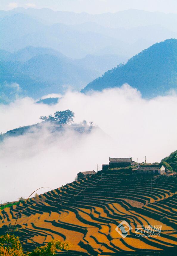 無量山上的漫灣鎮,從高海拔的地方往下看,安召、安樂、大路邊、岔山、上排首等幾個村,已被厚厚的云霧包裹著。就在幾個小時前的清晨時分,當山村還未醒來,在此起彼伏雄雞的報曉聲中,從瀾滄江順安樂河、漫灣河、排手河悄悄涌上來的霧由薄到厚,由黑灰變灰白,最終形成云海,山村被染成了水墨畫。隨著太陽慢慢升起,光線逐漸變化,山村又被染成金黃。當漫天霞光穿透薄霧,翻騰的云海在朝霞的掩映下,也泛成了一片耀眼的金黃。