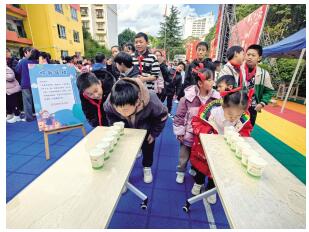 游園活動設置了“成語接龍”“蒙眼貼鼻子”“謎語猜猜猜”“可樂搭”“搶凳子”“吹乒乓球”“夾彈珠”“快樂呼啦圈”等12個游戲項目。每個活動點,同學們都整齊、有序地排隊積極參與。