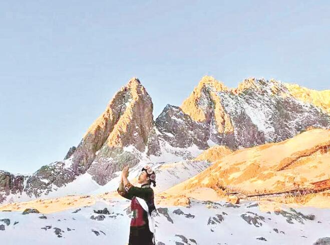 ② 攝影師喜迎玉龍雪山第一縷陽光。