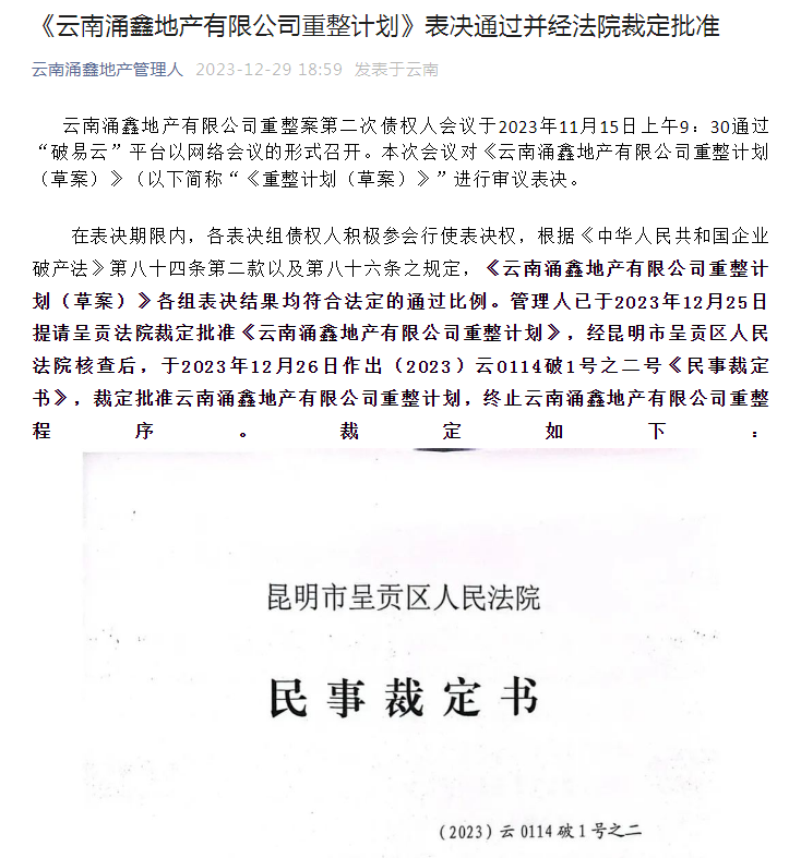 近日,云南涌鑫地產管理人發布公告稱,經昆明市呈貢區人民法院核查,裁定批準云南涌鑫地產有限公司重整計劃,終止云南涌鑫地產有限公司重整程序。