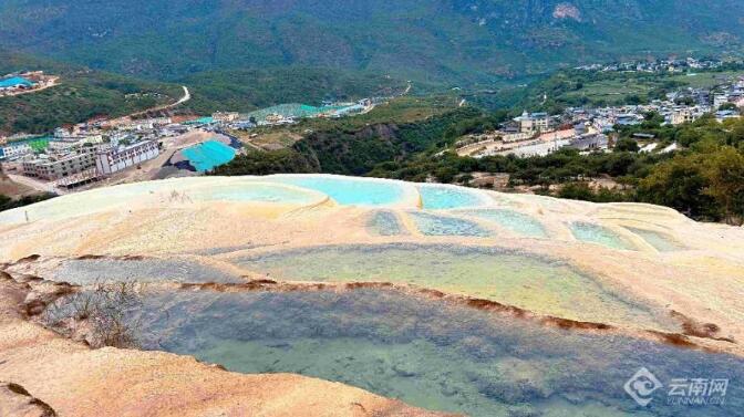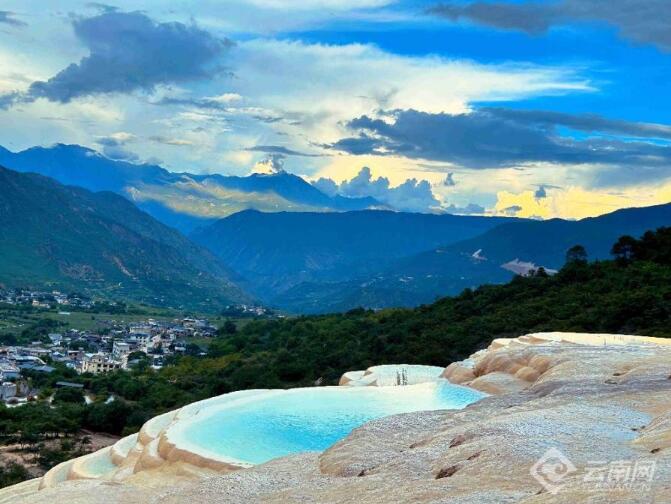 白水臺是由于碳酸鈣溶解于泉水中而形成的自然奇觀,層次分明的田埂勾勒出自然優(yōu)美的梯田線條,清澈透明的水填滿其中,在陽光的照耀下和藍(lán)天的映襯下水光呈現(xiàn)出神秘的蔚藍(lán)色,是中國最大的泉水臺地之一,有“仙人遺田”的美稱,也被游客稱為“東方棉花堡”。
