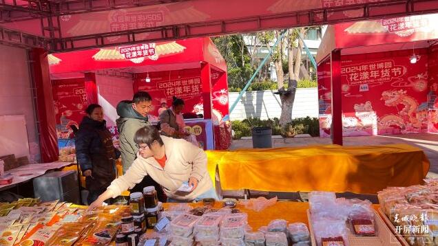 1月13日,“2024年世博園花漾年貨街”在昆明世博園花園大道開街,以年貨市集、特色美食、民俗非遺和互動游戲為特色的年貨街吸引了眾多游客和市民。