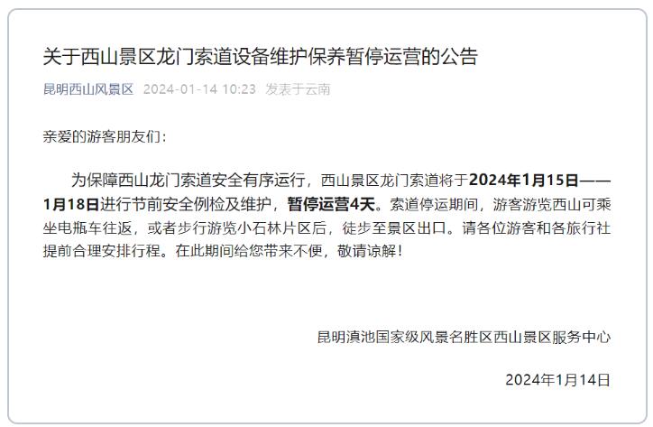 1月14日,昆明滇池國(guó)家級(jí)風(fēng)景名勝區(qū)西山景區(qū)服務(wù)中心發(fā)布公告,詳情如下——