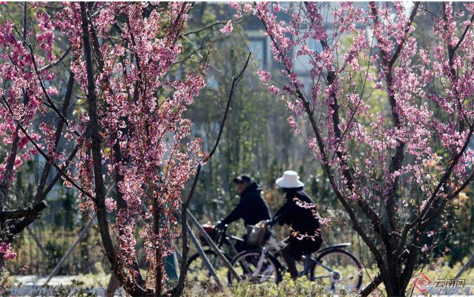 滇池綠道壩河濕地公園果紅花艷的“春意”景致。