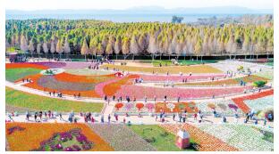 游人在昆明撈漁河濕地公園內賞花。新華社