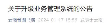 為更好地向廣大讀者提供高質量服務,云南省圖書館定于2024年1月20日至23日對業務自動化管理系統進行升級改造。在此期間,書刊借還、讀者卡辦理、網上續借、網上書目查詢等服務功能暫停使用,讀者所借書刊的借期順延4天,館內書刊閱覽、自習、展覽、講座、培訓等服務照常開展。