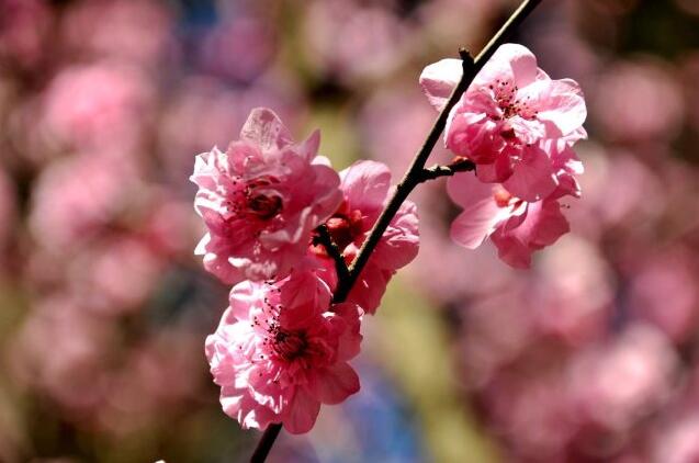 美人梅是由重瓣宮粉型梅花與紅葉李雜交而成的梅科花卉,每逢盛花期,漫山遍野一片粉色,煞是美麗。在郊野公園小吊橋兩側及美人谷,你不僅可以欣賞到美人梅,還可以欣賞到西府海棠、杜鵑花、櫻花、溪流等,在藍天白云的映襯下,將早春的氣息裝扮一新,更有一番風味。