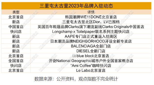 回顧2023年,觀點指數統計下的樣本項目引入超過200家店鋪,其中頭部企業的重點項目有更高的品牌吸引力,如三里屯太古里期內就有不少首店及新店開業。