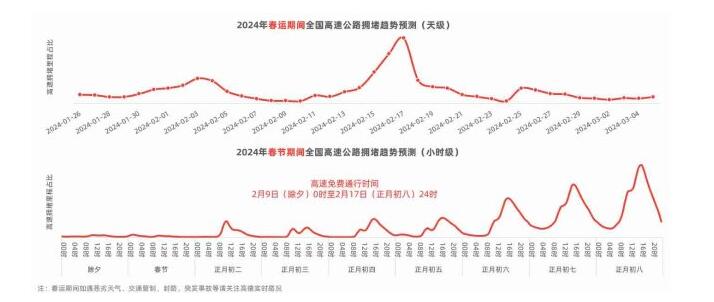 2024年春運從1月26日開始,3月5日結束,共計40天,預計全國旅客發送量將突破90億人次。1月30日,高德地圖發布了《2024年春運出行預測報告》(以下簡稱《報告》)。《報告》預測,春節期間預計2月11日(正月初二)上午時段全國高速交通壓力較大,而返程高峰為春節假期最后一天2月17日(正月初八)。《報告》根據多年同期歷史數據,通過大數據技術、機器學習、綜合研判等方法,對全國交通擁堵趨勢及出行特征進行預測,希望以此為旅客春運安全出行提供科學參考。