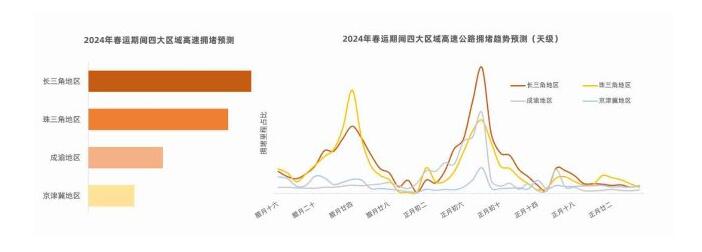 從區域來看,預計春運期間長三角地區、珠三角地區高速擁堵程度較高,其次是成渝地區,京津冀地區擁堵里程占比較低,長三角地區、珠三角區域高速擁堵里程占比約為京津冀地區3倍;珠三角地區出程高速擁堵程度高于返程,且在四大區域中出程擁堵程度最高,返程長三角地區高速擁堵程度最高。