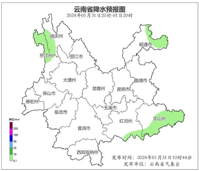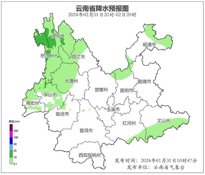 1月31日20時(shí)到2月1日20時(shí):昭通市北部、文山州南部、紅河州東南部、怒江州北部、迪慶州西部多云有分散性陣雨,其他地區(qū)晴間多云。
