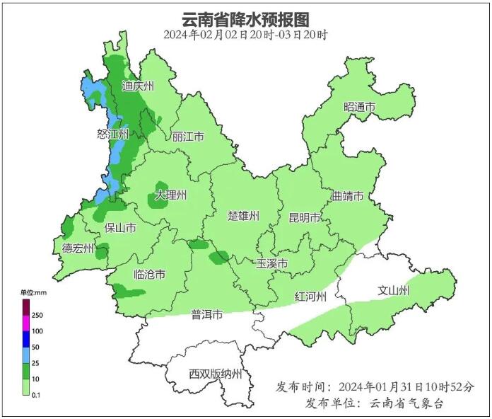 2月2日20時(shí)到2月3日20時(shí):怒江州、迪慶州陰有中雨局部大雨、暴雨,高海拔山區(qū)有中到大雪,麗江市、大理州、保山市、德宏州、臨滄市、普洱市北部陰有小雨局部中雨,楚雄州、昆明市、玉溪市、曲靖市、昭通市、紅河州北部和東南部、文山州南部多云間陰有陣雨,其他地區(qū)多云。
