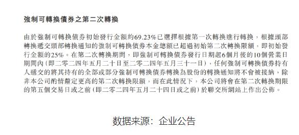2023年12月6日,融創公布強制可轉換債券第一次轉換結果公告,已收到本金總額約19.04億美元的轉換通知,占初始發行額約69.23%。