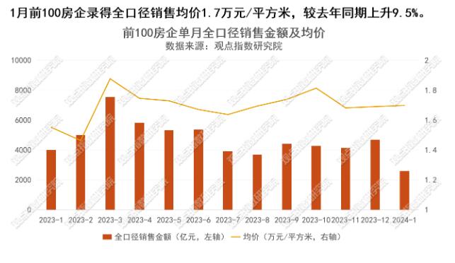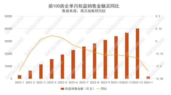 “2024年1月房地產企業銷售表現”研究成果顯示,1月份前100房企實現權益總銷售金額1793億元,同比下降35.9%。1月份,前100房企實現全口徑銷售金額2596億元,同比下降35.1%。
