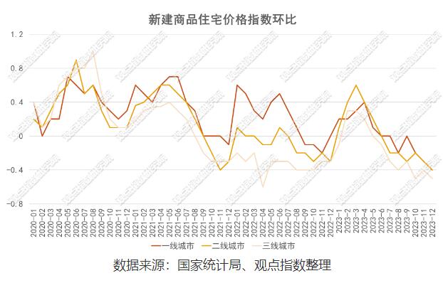 從價格上看,12月份70個大中城市新建商品住宅銷售價格環比上漲的有7個,比上月減少4個;一線城市新建商品住宅銷售價格環比下降0.4%,降幅較上月擴大0.1個百分點,其中北京環比持平,上海環比上漲0.2%,廣州、深圳環比分別下降1%和0.9%。