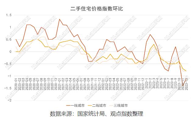 二、三線城市新建商品住宅銷售價格環比分別下降0.4%和0.5%,降幅均比上月擴大0.1個百分點。